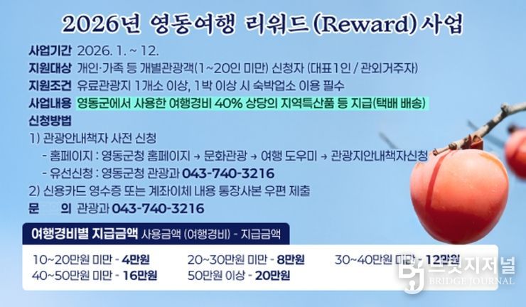 브릿지저널 김경미 기자 | 충북 영동군이 개인 및 가족 단위의 체류형 관광을 통해 지역경제를 활성화하고 영동군을 찾는 관광객들의 만족도를 높이기 위해 2026년 영동여행리워드사업을 1월부터 추진 중이라고 밝혔다.