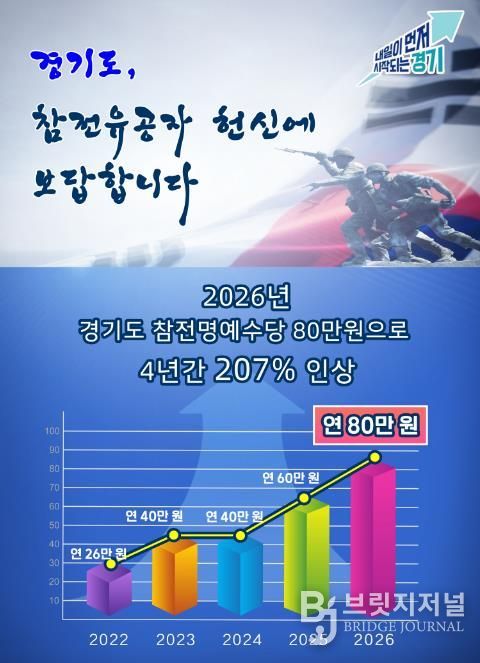 브릿지저널 김경미 기자 | 경기도가 참전유공자에 대한 예우를 강화하기 위해 2026년 경기도 참전명예수당을 연 80만 원으로 인상했다.