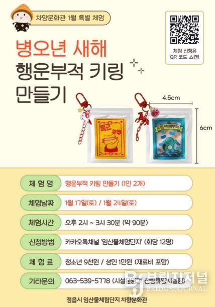 브릿지저널 윤나영 기자 | 정읍시 임산물체험단지 내 차향문화관이 2026년 새해를 맞아 오는 17일과 24일, 온 가족이 함께 참여해 새해 소망을 비는 ‘행운 부적 키링 만들기’ 프로그램을 운영한다고 13일 밝혔다.