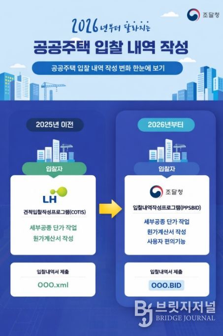 브릿지저널 김경미 기자 | 조달청은 2026년부터 LH 공공주택 입찰 시 내역서를 ‘조달청 입찰내역작성프로그램’을 이용하여 작성해야 한다고 밝혔다.
