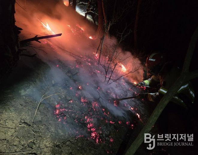 브릿지저널 정보영 기자 | 경상북도 소방본부가 10일 15시경에 발생한 의성군 의성읍 비봉리 일원 산불 현장에 ‘경북형 소방산불진화대’를 신속 투입해 산불 초기 진화와 확산 차단에 성공하며, 선제적 산불 대응 정책의 실효성을 입증했다.