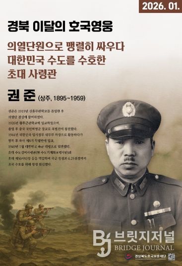브릿지저널 정보영 기자 | 경상북도호국보훈재단은 2026년‘경북 이달의 호국영웅’ 사업의 첫 주인공으로 독립운동가이자 대한민국 국방의 초석을 다진 상주 출신 권준(權晙, 1895~1959) 장군을 선정했다고 밝혔다.