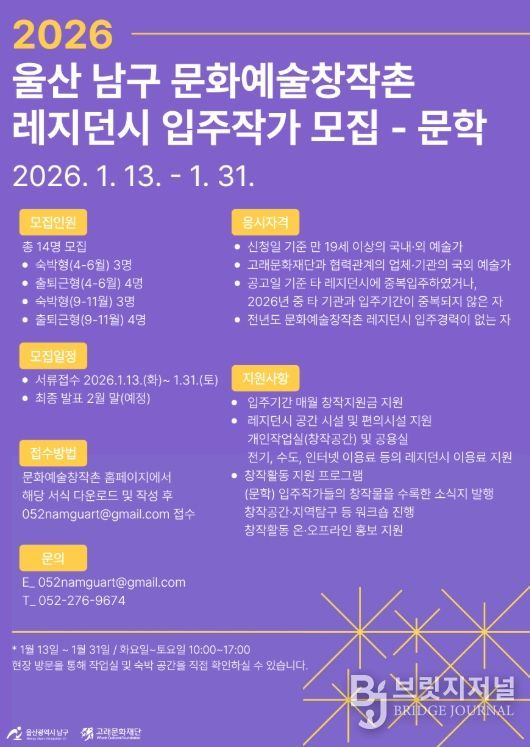 브릿지저널 윤나영 기자 | 고래문화재단이 운영하는 울산 남구 문화예술창작촌이 2026년도 레지던시 사업에 참여할 입주작가를 1월 13일부터 1월 31일까지 공개 모집한다.
