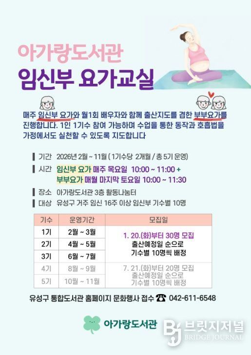 브릿지저널 정보영 기자 | 대전 유성구는 아가랑도서관에서 2월부터 11월까지 임신부의 건강한 출산과 가족 친화 문화 조성을 위한 ‘임신부 요가교실’을 운영한다.