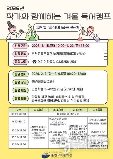 브릿지저널 윤나영 기자 | 춘천교육문화관(관장 유선종)은 겨울 방학을 맞아 오는 2월 3일부터 2월 6일까지 4일간 초등학교 3~4학년 20명을 대상으로 겨울 독서캠프를 운영한다.