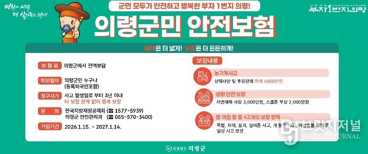 브릿지저널 김경미 기자 | 의령군은 일상생활 중 예기치 못한 재난과 사고로부터 군민의 생활 안정을 지원하기 위해 ‘2026년 군민안전보험’에 갱신 가입하고, 1월 15일부터 본격 운영에 들어간다고 밝혔다.