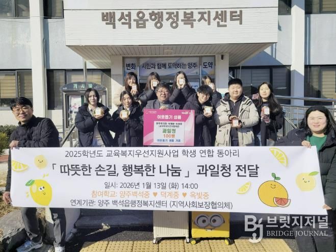 브릿지저널 김경미 기자 | 양주시 백석중학교, 덕계중학교, 옥빛중학교가 함께하는 교육복지우선지원사업 학생 연합 동아리가 지역사회를 위한 따뜻한 나눔을 실천했다.