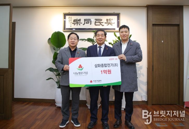 브릿지저널 김경미 기자 | 남양주시는 14일 삼화종합전기가 사회복지공동모금회의 고액 기부 프로그램인 ‘나눔명문기업’ 5호로 가입하고, 지역 내 취약계층 지원을 위해 1억 원 기부를 약정했다고 밝혔다.