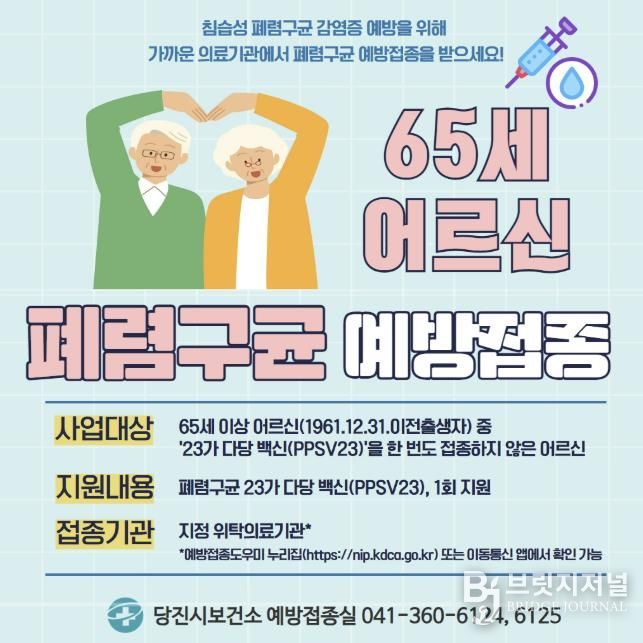 브릿지저널 정보영 기자 | 당진시는 관내 65세 이상(1961.12.31. 이전 출생자) 중 23가 다당질 폐렴구균 백신(PPSV23)을 한 번도 접종하지 않은 어르신을 대상으로 폐렴구균 무료 예방접종을 실시한다고 15일 밝혔다.