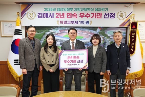 브릿지저널 김경미 기자 | 김해시는 행정안전부 주관 ‘2025년 지방규제혁신 추진 성과평가’에서 2024년에 이어 2년 연속 우수기관으로 선정돼 특별교부세 1억 원을 확보했다고 15일 밝혔다.