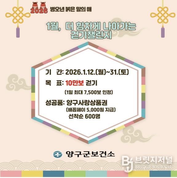 양구군은 1월부터 ‘워크온 걷기 챌린지’를 운영하며, 다양한 걷기 행사와 참여형 챌린지를 지속적으로 추진할 예정이다. 1월에는 목표 걸음 10만 보 이상, 2월부터 11월까지는 매달 목표 걸음 20만 보 이상을 걷는 주민에게 양구사랑상품권(배꼽페이) 5000원을 지급한다. 챌린지 기간 동안 하루 최대 7500보까지 인정되며 선착순 600명에게 지급한다.