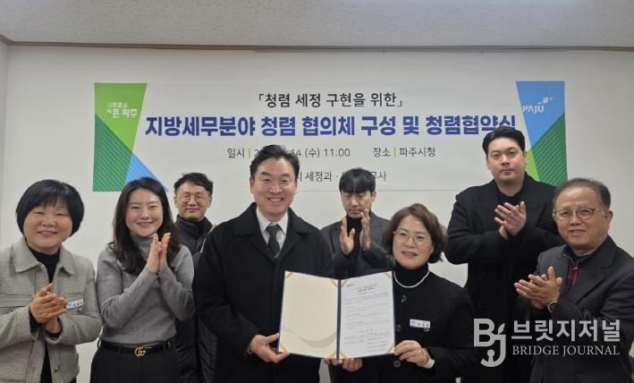 브릿지저널 김경미 기자 | 파주시는 지난 14일 파주지역세무사회(마을세무사)와 함께 청렴 문화의 정착과 확산을 위한 민관 청렴협의체를 구성하고, 청렴 실천을 위한 협약을 체결했다고 밝혔다.