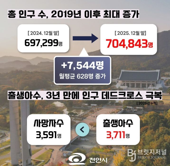 브릿지저널 정보영 기자 | 천안시는 지난해 5월 총인구 70만 명을 돌파한 이후 증가세를 이어가며 2019년 이후 최대 인구 증가 기록을 경신했다고 15일 밝혔다.