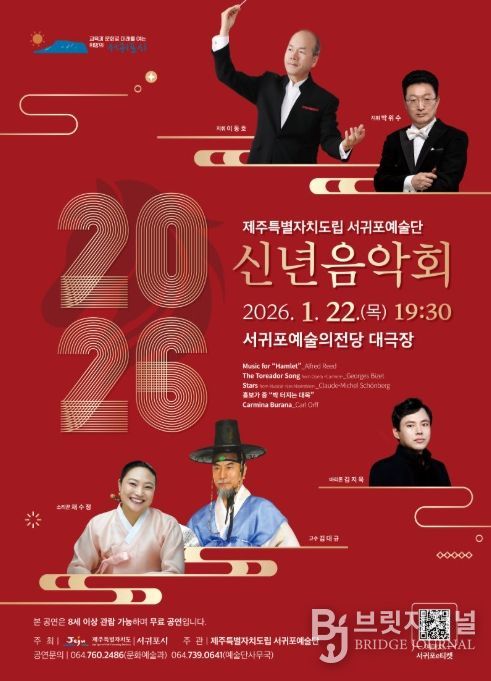 브릿지저널 정보영 기자 | 서귀포시는 1월 22일 19시 30분 서귀포예술의전당 대극장에서 ‘제주특별자치도립 서귀포예술단 2026 신년음악회’를 개최한다.
