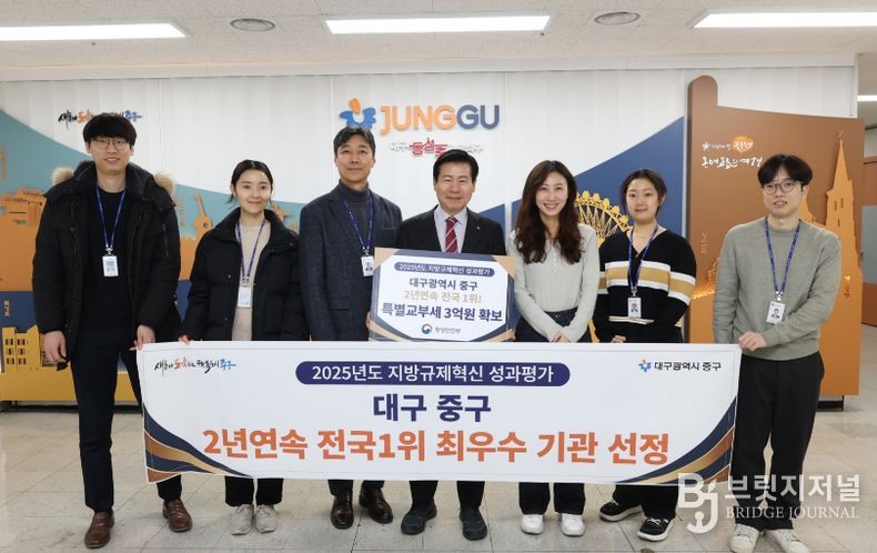 브릿지저널 김진석 기자 | 대구 중구는 행정안전부가 주관한 ‘2025년 지방규제혁신 성과평가’에서 2년 연속 최우수 기관으로 선정되며 규제혁신 선도 도시로서의 위상을 다시 한번 입증했다.