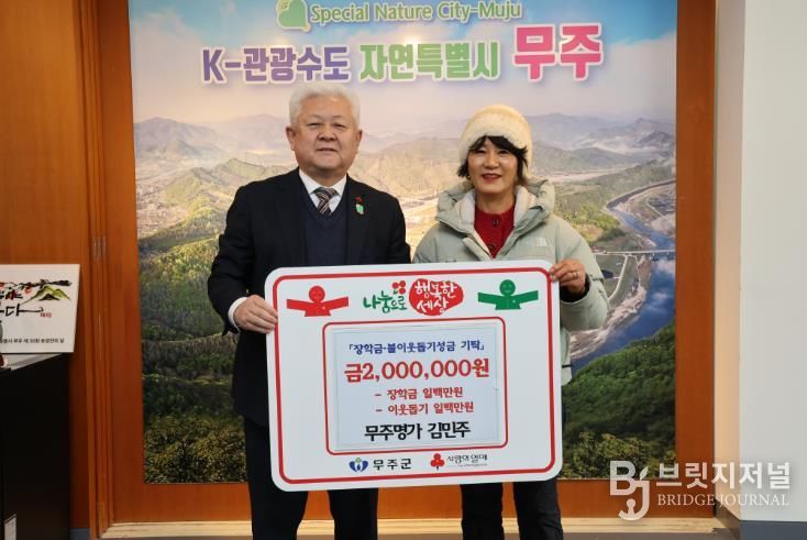 브릿지저널 윤나영 기자 | 무주군 무주읍에 위치한 한식 전문점 ‘무주명가’의 김민주 사장이 지난 14일 무주군에 이웃돕기 성금 1백만 원, (재)무주군교육발전장학재단에 장학금 1백만 원 등 총 2백만 원을 기탁했다.