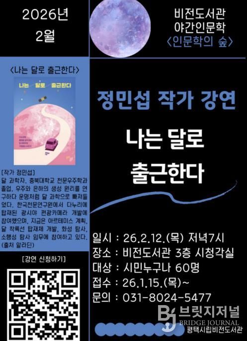 브릿지저널 김경미 기자 | 평택시 비전도서관은 오는 2월 12일 저녁 7시 달 과학자 정민섭 작가를 초청하여 ‘나는 달로 출근한다’를 주제로 야간 인문학 강연을 진행한다.