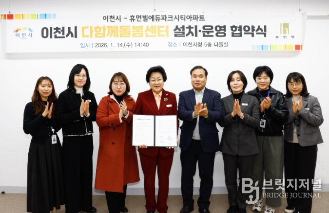 브릿지저널 김경미 기자 | 이천시는 지난 14일 시청에서 휴먼빌에듀파크시티아파트와 단지 내 ‘다함께돌봄센터 설치·운영을 위한 업무 협약’을 체결했다고 밝혔다. 이날 협약식에는 이도아 입주자 대표회의 회장을 비롯한 관계자들이 참석했다.