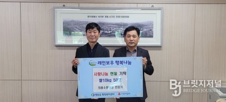브릿지저널 김경미 기자 | 충북 영동군 영동읍의용소방대장 민창기 씨가 어려운 이웃을 돕기 위해 16일 영동읍행정복지센터에 쌀 10kg 50포를 기탁했다.
