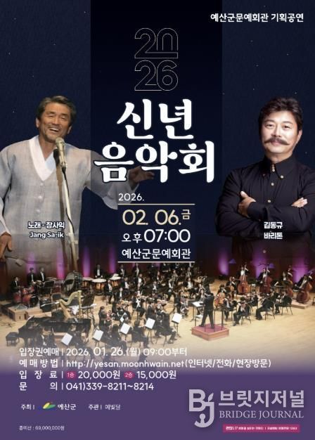 브릿지저널 정보영 기자 | 예산군은 군민과 함께 희망찬 2026년 새해를 여는 ‘2026년 신년 음악회’를 오는 2월 6일 오후 7시 예산군문예회관 공연장에서 개최한다고 밝혔다.