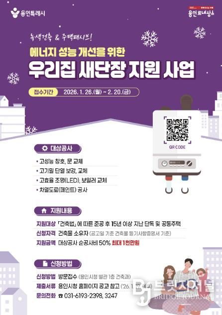 브릿지저널 김경미 기자 | 용인특례시가 오는 26일부터 2월 20일까지 노후주택 에너지 효율 개선 지원 사업인 ‘우리집 새단장 지원사업’ 신청을 받는다고 16일 밝혔다.