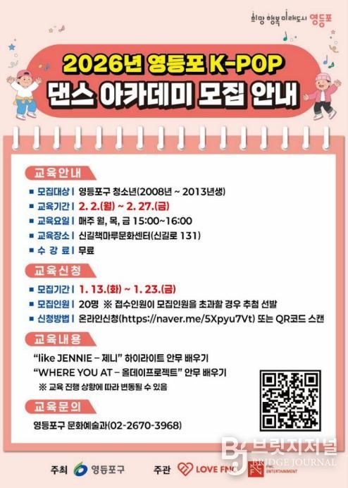 브릿지저널 김경미 기자 | 영등포구가 지역 청소년들이 K-POP 문화를 직접 체험하며 자신감을 키우고 예술적 재능을 마음껏 펼칠 수 있도록 ‘영등포 K-POP 댄스 아카데미’ 를 운영한다고 밝혔다.