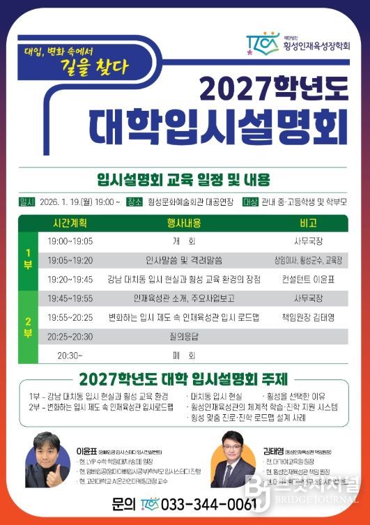 브릿지저널 윤나영 기자 | (재)횡성인재육성장학회는 오는 1월 19일 오후 7시, 횡성문화예술회관에서 관내 중·고등학생과 학부모를 대상으로 ‘2027학년도 대학입시설명회’를 개최한다고 밝혔다.