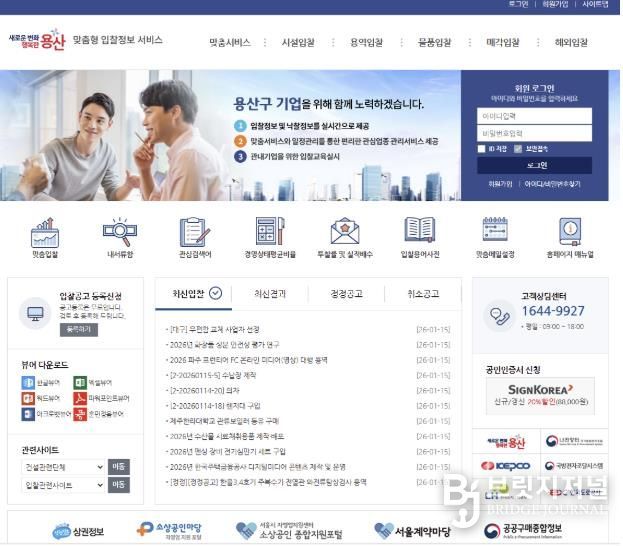 브릿지저널 김경미 기자 | 서울 용산구가 2026년에도 ‘맞춤형 입찰정보시스템’을 운영해 지역 내 중소기업·소상공인이 관심 분야의 공공입찰 정보를 빠르고 정확하게 받아볼 수 있도록 지원한다. 정보 탐색 부담을 줄이고 공공조달 참여를 촉진해 지역 기업들의 판로를 개척하고 지역경제를 활성화하기 위한 취지다.