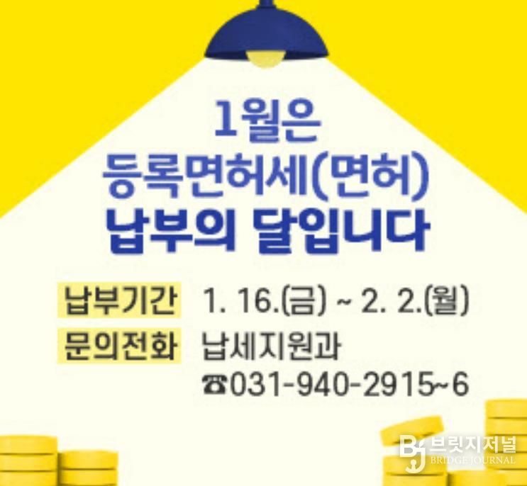 파주시 관계자는 “등록면허세(면허)는 비교적 소액이어서 납부를 놓치는 경우가 많다”라며, “납부기한이 경과하면 부과 금액의 3%에 해당하는 납부지연 가산세가 추가되므로 반드시 기한 내 납부해 주시길 바란다”라고 당부했다.