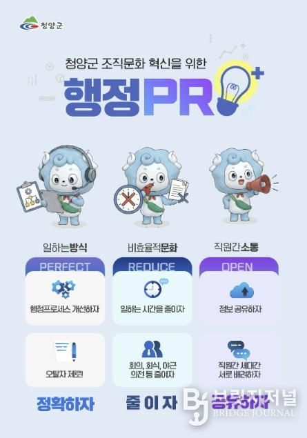브릿지저널 정보영 기자 | 청양군은 조직문화 혁신과 행정 효율성 제고를 위해 더욱 고도화된 ‘행정PRO+ 운동’을 적극 추진할 계획이라고 16일 밝혔다.