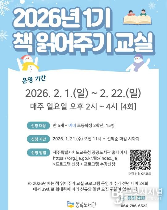 브릿지저널 정보영 기자 | 제주도교육청 동녘도서관은 2월 1일부터 22일까지 평생교육실에서 유아 및 저학년 어린이의 독서 흥미와 창의력 향상을 위한 ‘2026년 1기 책 읽어주기 교실’을 운영한다.