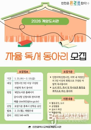 브릿지저널 김경미 기자 | 인천광역시교육청계양도서관은 지역 내 독서 문화를 확산하고 시민의 자발적인 독서 활동을 지원하기 위해 ‘2026년 자율 독서동아리’를 모집한다.