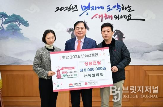 브릿지저널 정보영 기자 | 김천시는 지난 15일, ㈜예원테크(대표 정재욱)로부터 희망2026나눔캠페인 성금 500만 원을 전달받았다고 밝혔다.