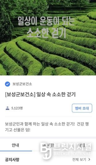 브릿지저널 김경미 기자 | 보성군은 2026년 한 해 동안 군민 누구나 참여할 수 있는 모바일 앱 활용 비대면 건강 증진 프로그램인 ‘소소한 걷기 챌린지’를 연중 운영한다고 밝혔다.