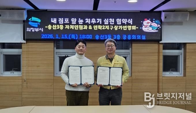 브릿지저널 김경미 기자 | 의정부시 송산3동행정복지센터는 1월 15일 청사 3층 공용회의실에서 민락2지구상가번영회와 ‘내 점포 앞 눈 치우기 협약’을 맺었다.