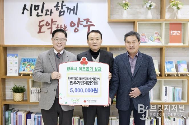 브릿지저널 김경미 기자 | 양주시가 지난 15일 시장실에서 양주검준패션칼라사업협동조합을 비롯한 관련 단체 및 기업으로부터 이웃돕기 성금과 성품을 기탁받았다고 밝혔다.