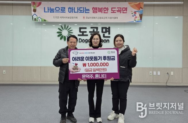 브릿지저널 김경미 기자 | 도곡면은 지난 14일 관내에 거주하는 문덕주·혼나티 부부가 지역 내 어려운 이웃을 위해 100만 원을 도곡면 지역사회보장협의체에 기부했다고 밝혔다.