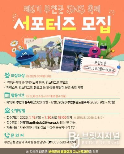 브릿지저널 윤나영 기자 | 부안군은 오는 19일부터 30일까지 부안의 대표 축제를 홍보할 제6기 부안군 SNS 축제 서포터즈’를 모집한다.