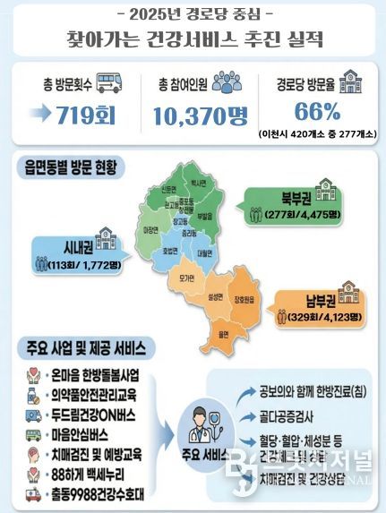 분석 결과, 2025년 한 해 동안 경로당 277개소를 총 719회 순회하여 10,370명의 어르신에게 한방진료, 골밀도 측정, 건강상담, 치매검진, 운동교실 등 다양한 건강관리서비스를 제공했다. 이는 이천시 전체 경로당의 66%(277개소)에 달하는 수치다.