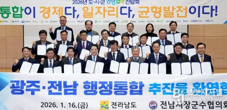 브릿지저널 김경미 기자 | 전라남도는 16일 전남도청 왕인실에서 ‘2026년 도-시군 상생협력 간담회’를 열어 지역 대도약을 위한 광주·전남 행정통합 추진에 도와 22개 시군이 공동 보조를 맞추기로 했다.