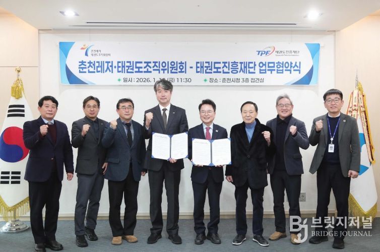 브릿지저널 윤나영 기자 | 춘천레저·태권도조직위원회(위원장 육동한)와 태권도진흥재단(이사장 김중헌)이 16일 태권도 발전과 국제 경쟁력 강화를 위해 손을 맞잡았다.