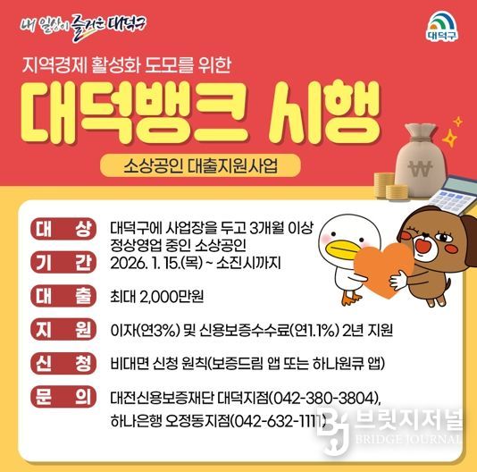 브릿지저널 정보영 기자 | 대전 대덕구는 경기침체로 자금 운용에 어려움을 겪는 지역 소상공인의 금융 부담을 완화하기 위해 소상공인 대출지원사업 ‘2026 대덕뱅크’를 시행한다.