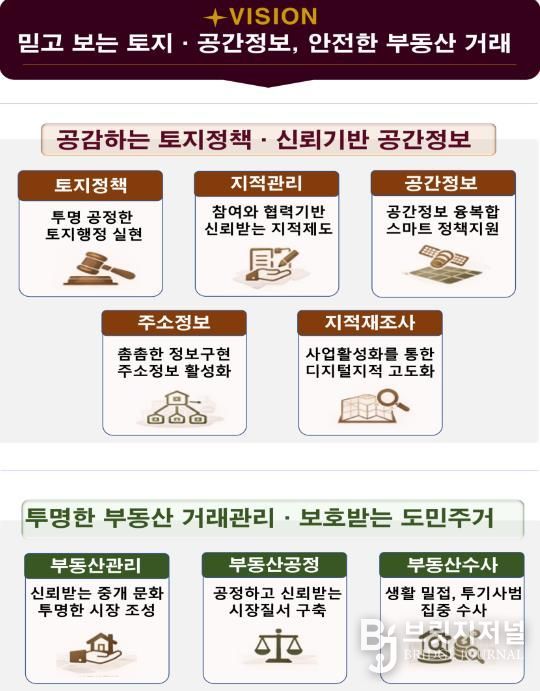 추진계획은 ▲투명하고 균형 잡힌 제도 운영으로 신뢰받는 토지행정 실현 ▲참여와 협력을 통한 신뢰받는 지적제도 정착 ▲공간정보 융·복합을 통한 스마트한 정책 지원 ▲촘촘한 주소정보 구현 및 주소정보 활성화 추진 ▲사업활성화를 통한 디지털지적 고도화 ▲신뢰받는 중개 문화와 투명한 부동산 시장 조성 ▲공정하고 신뢰받는 시장질서 구축 ▲생활밀접, 투기사범 집중수사 등 8대 전략을 바탕으로 한 92개 세부 이행과제로 구성됐다.
