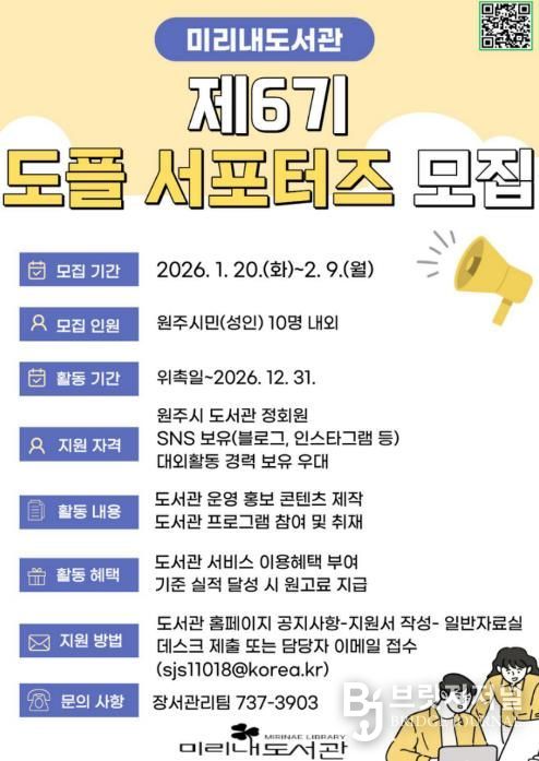 브릿지저널 윤나영 기자 | 원주시 미리내도서관은 오는 20일부터 올 한 해 도서관과 함께 할 ‘제6기 도플 서포터즈’를 모집한다.