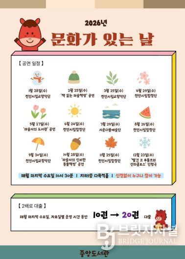 브릿지저널 정보영 기자 | 천안시 중앙도서관은 매달 마지막주 수요일 ‘2026 문화가 있는 날’을 운영한다고 19일 밝혔다.