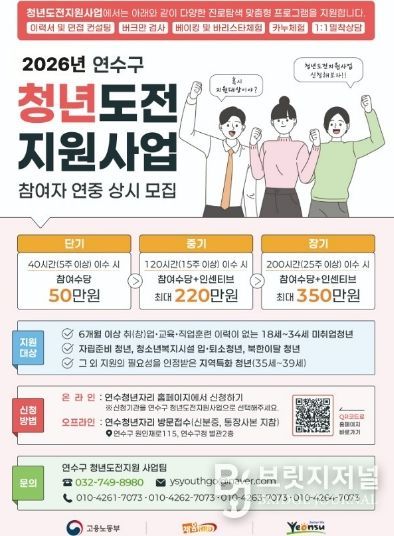 브릿지저널 김경미 기자 | 연수구는 청년들의 경제 활동과 노동시장 진입을 돕기 위해 ‘2026년 청년도전지원사업’ 참여자를 모집한다.