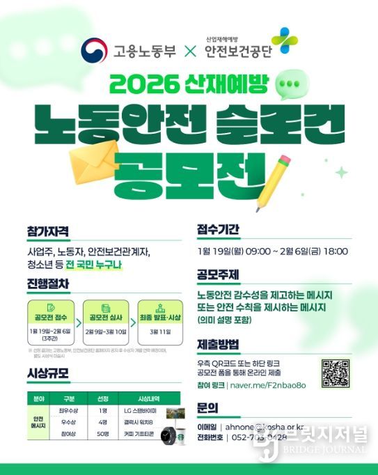 브릿지저널 김경미 기자 | 고용노동부와 한국산업안전보건공단은 1월 19일부터 우리 국민 누구나 참여할 수 있는 산재예방 노동안전 슬로건 공모를 실시한다.