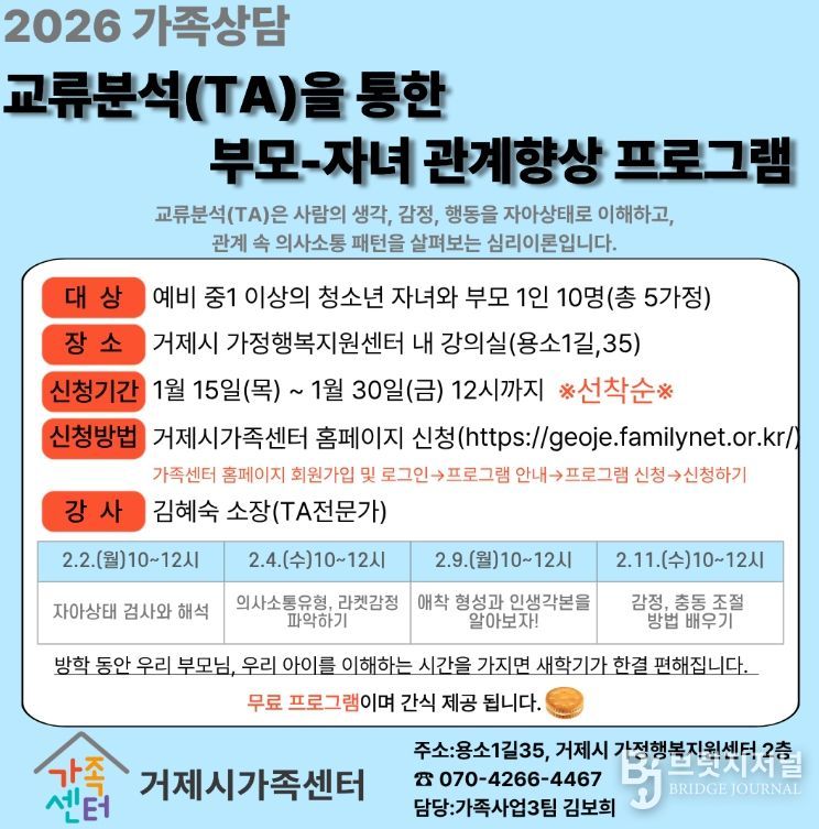 브릿지저널 김경미 기자 | 거제시가족센터는 오는 2일부터 진행하는'교류분석(TA)을 통한 부모–자녀 집단상담 프로그램' 참여자를 모집한다고 밝혔다.
