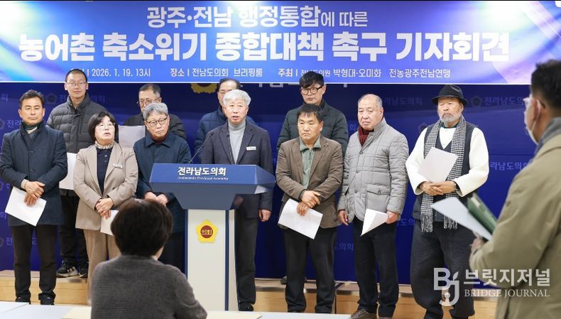 브릿지저널 김경미 기자 | 전라남도의회 박형대 의원(진보당·장흥1)은 1월 19일 도의회 브리핑룸에서 기자회견을 열고 “광주ㆍ전남 행정통합 논의가 속도를 내고 있지만 농어촌 축소 위기에 대한 대비는 현저히 부족하다”며 농어촌 보호를 위한 구체적 합의를 요구했다.