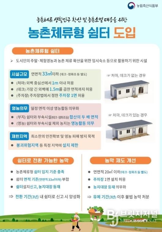 농촌체류형 쉼터는 농지 내 총면적 33㎡ 이내에서 설치할 수 있으며, 주차공간과 데크, 정화조 등 부대시설 설치가 가능하다.